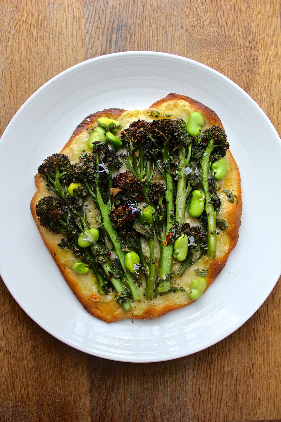 For 6 pizzettas with purple sprouting broccoli and broad beans: