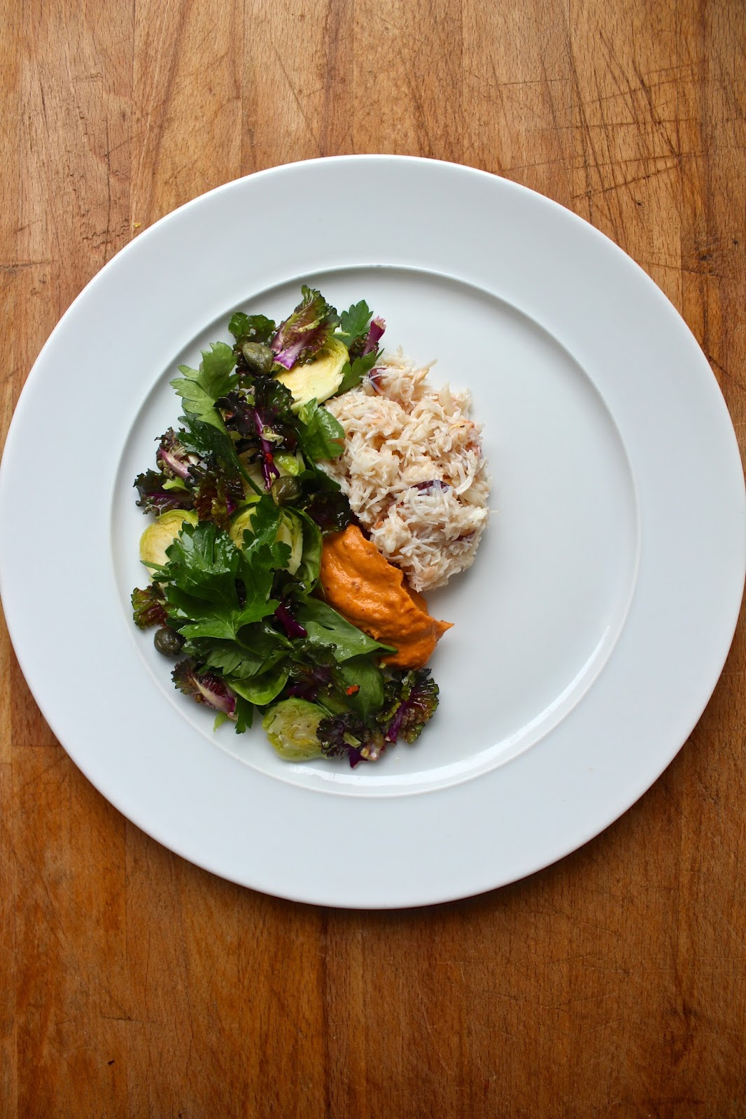 So yes, a salad. But the focus of this salad is some very special crabmeat. There are few things in cooking greater than boiling up a whole crab, before meticulously picking every last scrap of meat from the still warm shell, ideally surrounded by piles of bread and mayonnaise. But I appreciate that some don’t have the time and space, and that it might not be appropriate for the moderately squeamish. Failing that, there are some excellent hand-picked, unpasteurised crab products available, that allow this little plateful to be prepared in a matter of moments. The bright, fresh shellfish contrasts with the bitter sprouts wonderfully, with dinky capers and fiery chilli flakes adding a welcome kick along the way.