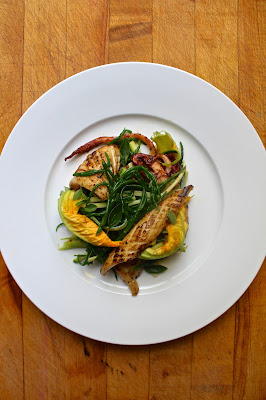 To serve, layer the squid and the samphire and courgette salad onto each plate. Finish with an extra squeeze of lemon juice and a crack of black pepper.